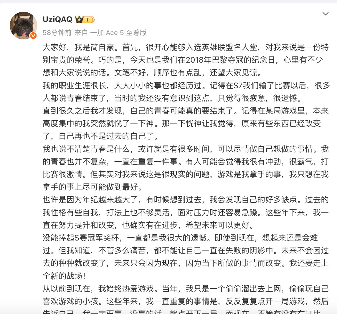 随后,简自豪(Uzi)本人发长文对荣膺英雄联盟名人堂第二位成员一事进行了回应,表示这对自己来说是“特别宝贵的荣誉”。他表示:“没能捧起S赛冠军奖杯,一直都是我很大的遗憾。即使到现在,想起来还是会难过。但我知道,不管多么痛苦,都不能让自己一直在失败的阴影中,我还要走上全新的战场!”