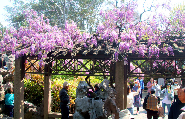 搭客在苏州古典园林狮子林灵通的紫藤花旁赏花游览。紫藤属于先叶后花品种。府上图/ICphoto