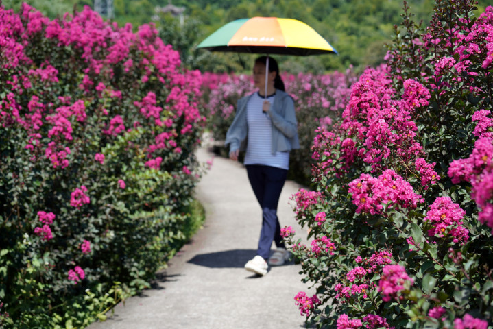 搭客在浙江省永嘉县岩头镇芙蓉村紫薇花坛赏花游玩。紫薇属于先叶后花品种。府上图/ICphoto