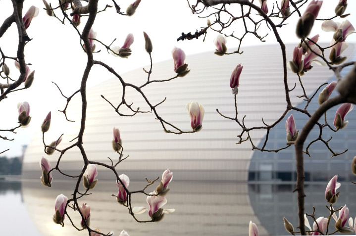 3月1日,国度大剧院前的数株玉兰悄然灵通。玉兰属于先花后叶品种。新京报记者李木易摄