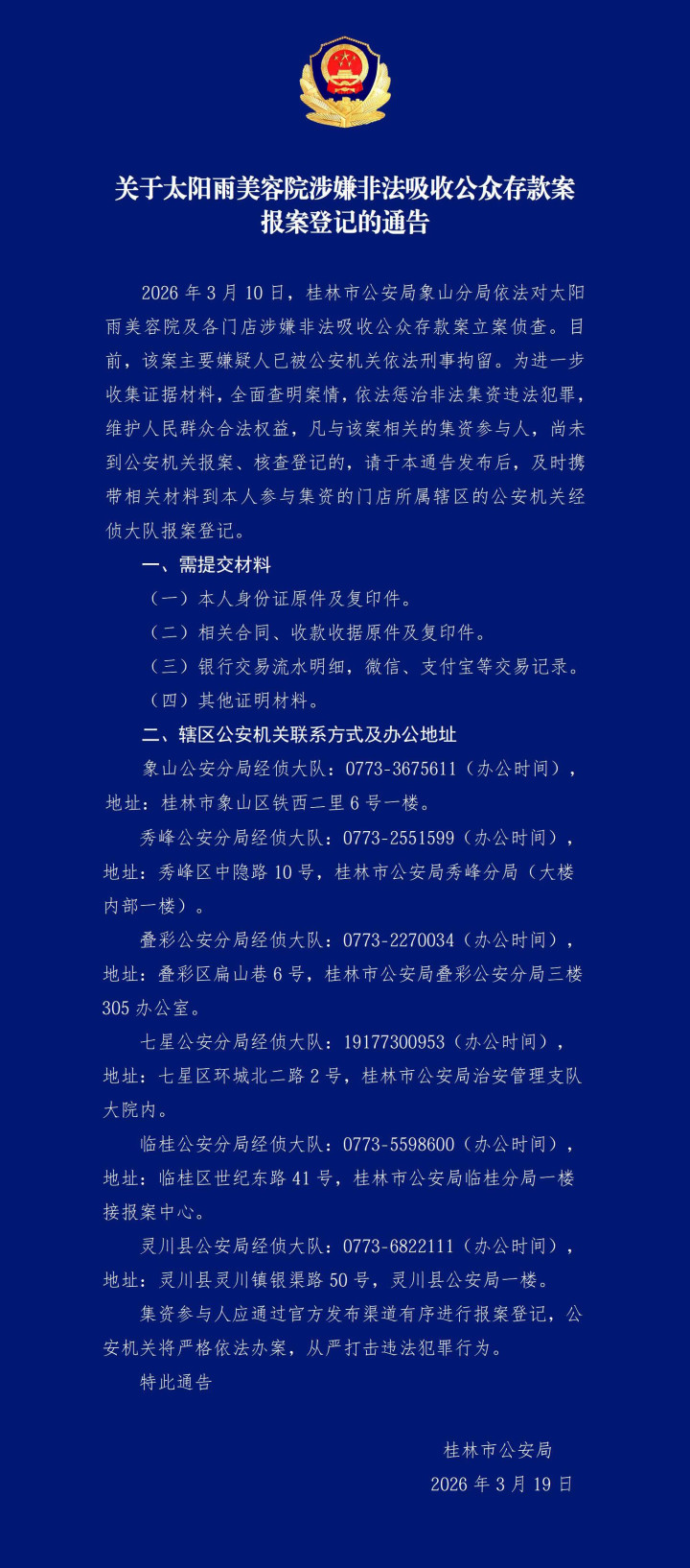 今天(20日),记者从桂林市公安局了解到,针对广西桂林太阳雨好意思容院涉嫌行恶收受公众入款案报案登记相工作件,该局发布相干通知: