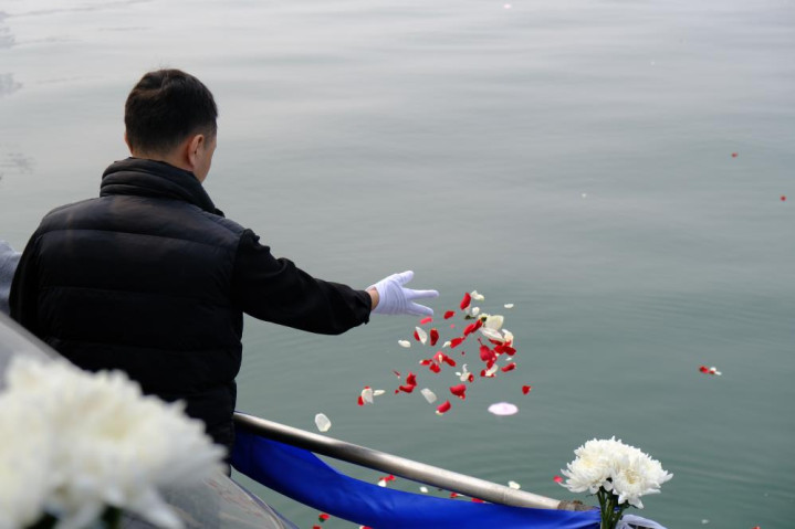 死人家属在完成骨灰海葬庆典后将花瓣撒向大海。新华社记者夏子麟摄